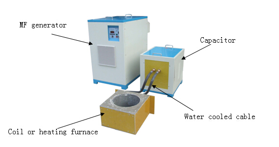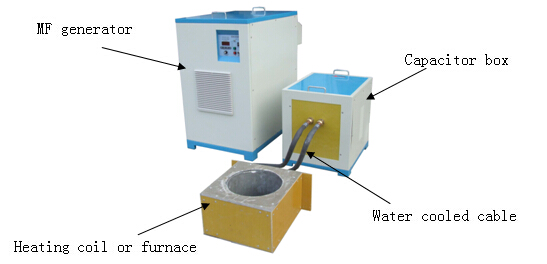 We generally supply MF generator and capacitor box as the picture shown below, generator and capacitor is connected with co-axial cable, and water cooled cable is used to link capacitor and coil.