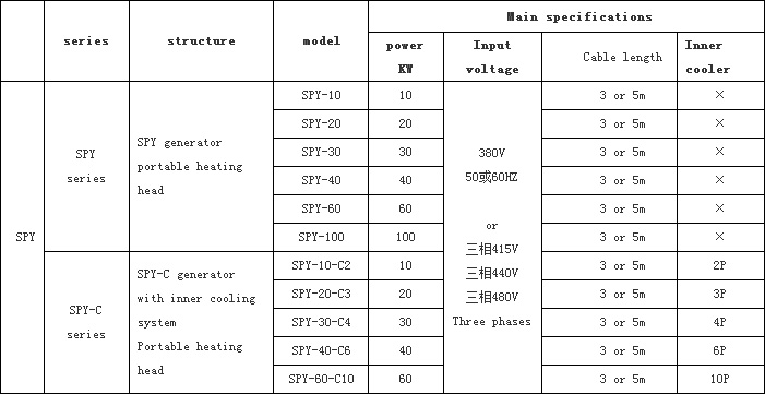 (1)  SPY series products: SPY machines are consisted of SPY generator and Portable heating head with  3 or 5 meter long connecting cable,  and are suitable for copper connector brazing of transformer and copper tube brazing of  air conditioner, etc.; Main products  includes   SPY-10、SPY-20、SPY-30、SPY-40、SPY-60 and SPY-100;