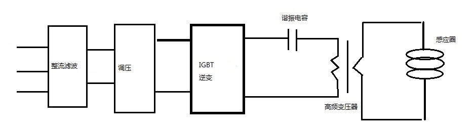 SP系列設備全部采用串聯諧振電路,諧振后通過高頻變壓器輸出低電壓、大電流的高頻電源;