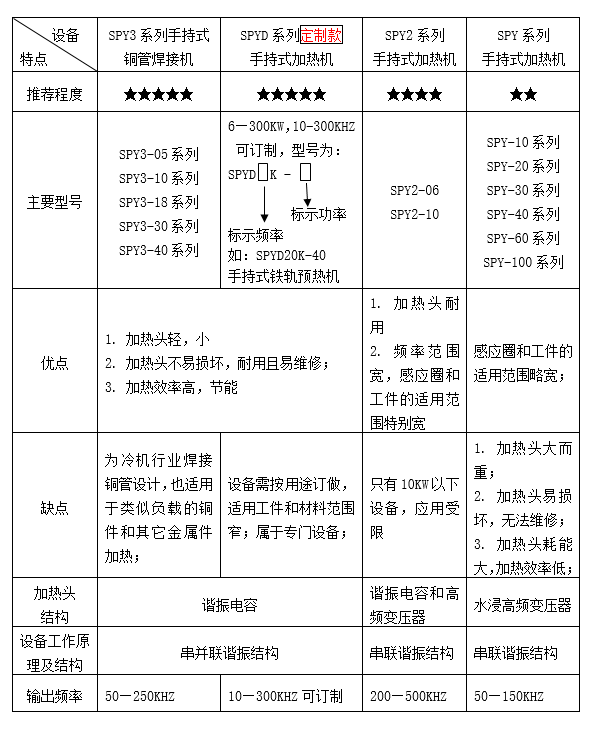 手持式加熱機(jī)是對小分機(jī)設(shè)備的一種特殊設(shè)計(jì)和應(yīng)用。 按照設(shè)備的結(jié)構(gòu)和工作原理不同,雙平手持式加熱機(jī)暫時(shí)分為以下4個(gè)系列,其特點(diǎn)和結(jié)構(gòu)對比如下表: 其中SPY3系列和SPYD定制系列由于其突出的優(yōu)點(diǎn),應(yīng)用非常廣泛,而且隨著智能設(shè)備和自動(dòng)化進(jìn)程的發(fā)展,這類設(shè)備的應(yīng)用將越來越多;
